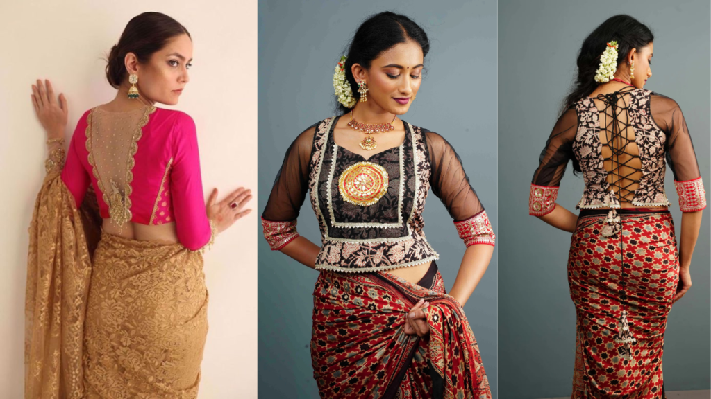 ट्रांसपेरेंट नेट का योक और उस पर हैवी ज़री या रेशम का काम। लाइट कलर की साड़ी (पेस्टल पिंक, मिंट ग्रीन) के साथ ये ब्लाउज़ किसी परी जैसा लुक देता है।