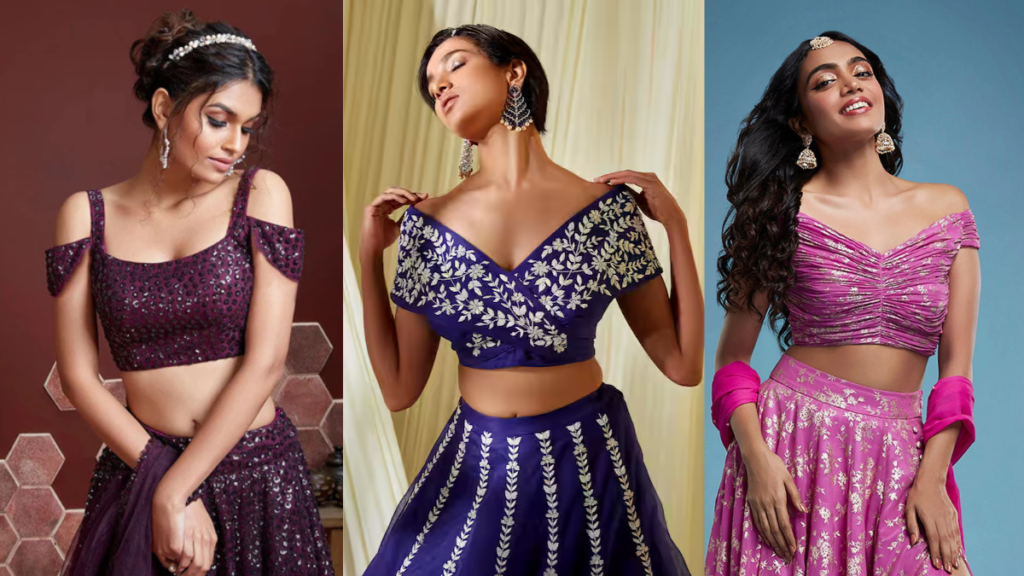 स्वीटहार्ट नेक या वन-साइड ऑफ-शोल्डर ब्लाउज नेट या सैटिन साड़ी के साथ हॉट लुक देते हैं।