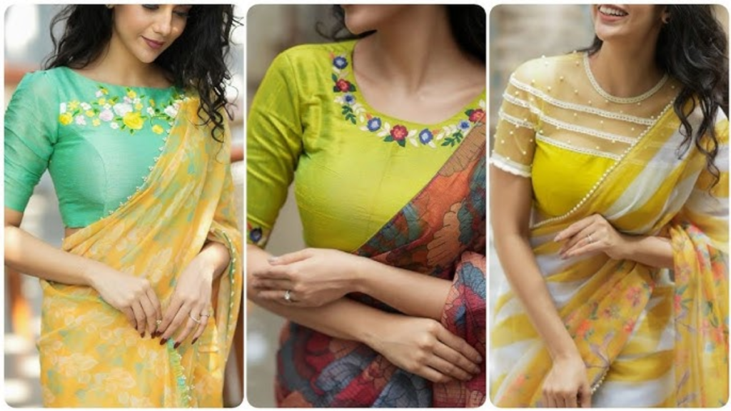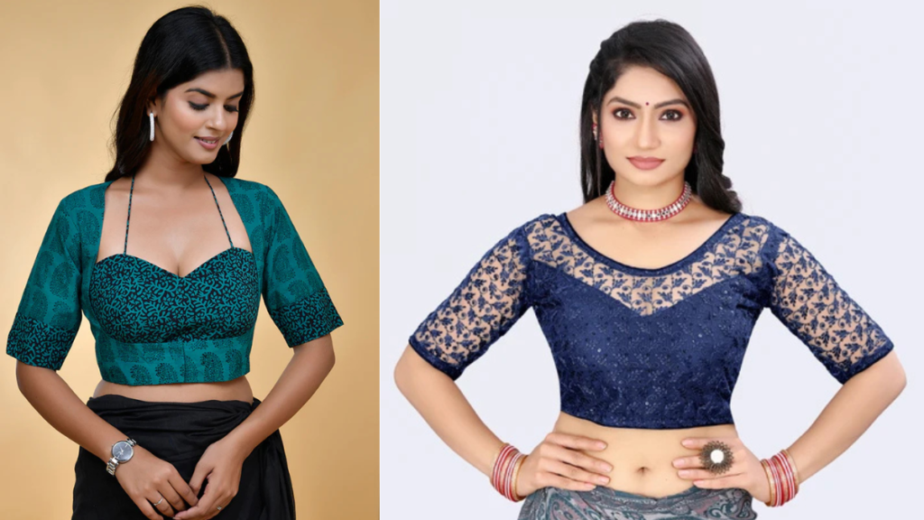 1. शीर ऑर्गेंजा और नेट ब्लाउज: रोमांटिक और लाइटवेट लुक