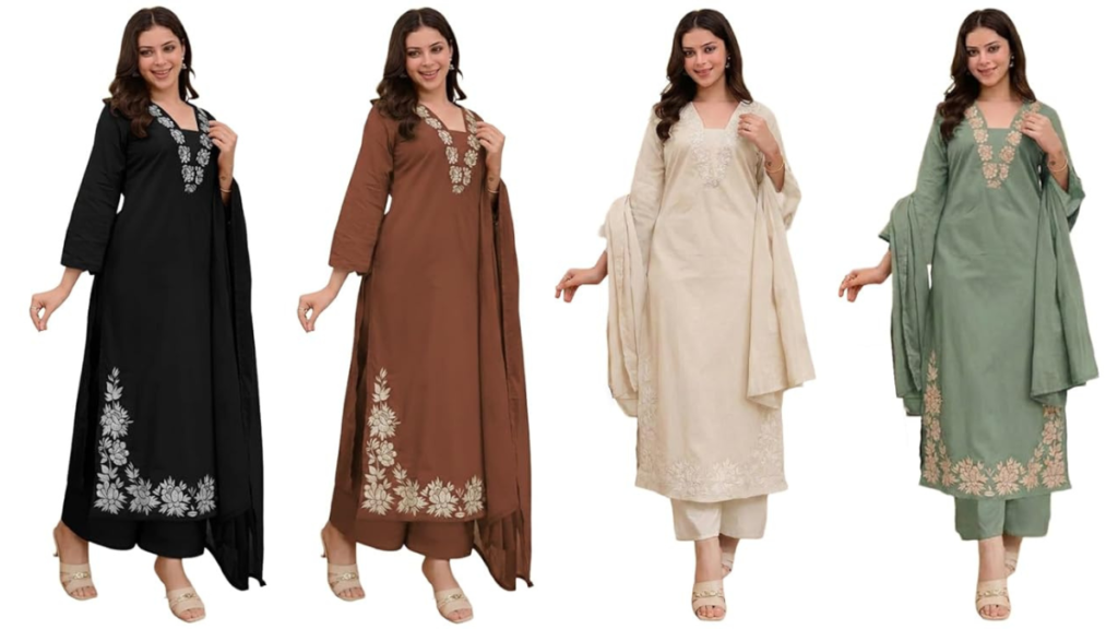 इस कुर्ता सेट को कई रंग विकल्पों में उपलब्ध कराया गया है। इससे अलग-अलग पसंद और अवसर के अनुसार चयन किया जा सकता है।