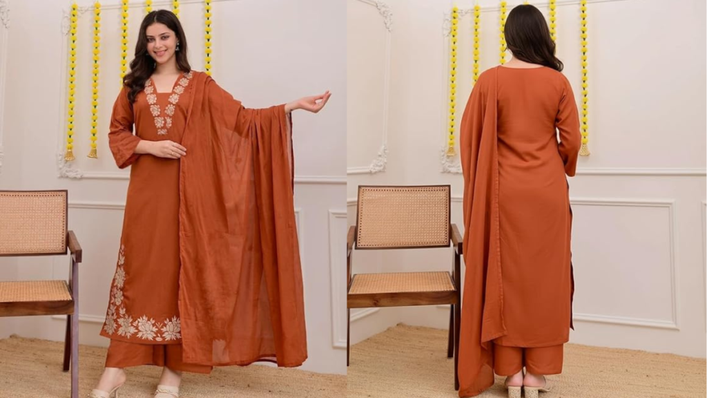 रस्ट ऑरेंज शेड एथनिक आउटफिट में एक अलग विजुअल टोन देता है। यह रंग न बहुत चमकीला लगता है और न ही फीका — इसलिए डे फंक्शन, ऑफिस फेस्टिव डे, और फैमिली गैदरिंग में पहना जा सकता है।