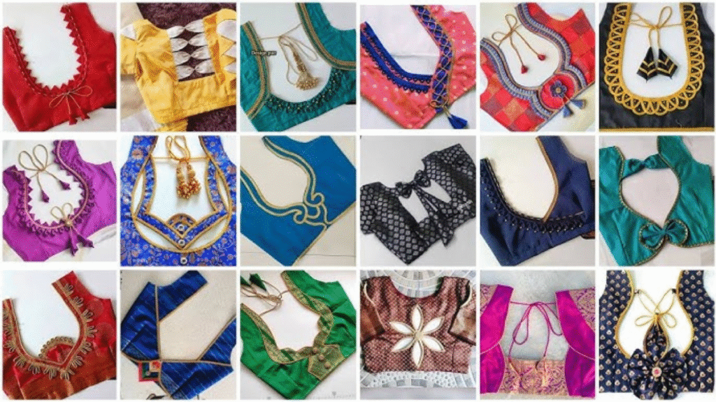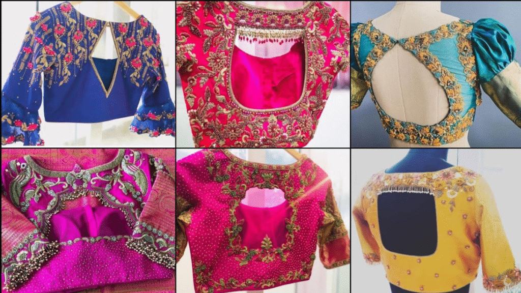 ब्लाउज का बैक अब सिर्फ कवर नहीं, स्टेटमेंट है। डीप यू-नेक, डोरी टाइज, शीयर नेट विद एम्ब्रॉयडरी या केप स्लीव्स