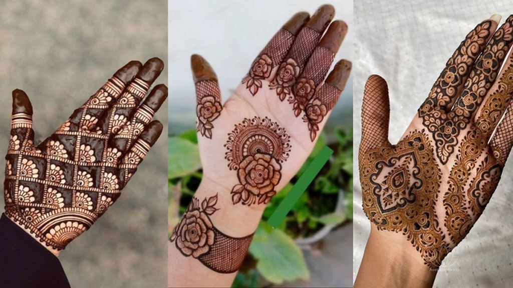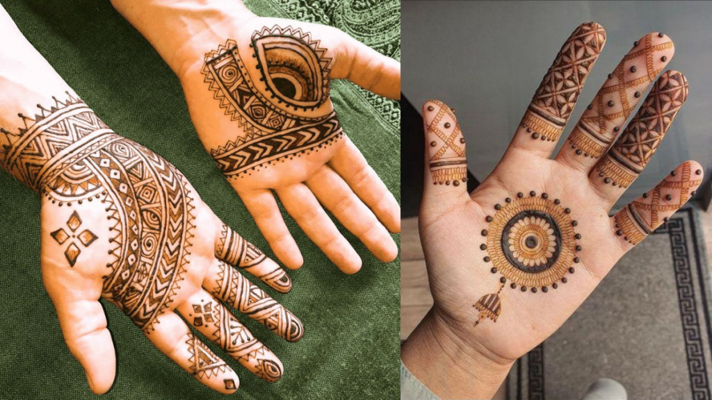 - Half Hand Mehndi: हथेली या हाथ के एक हिस्से पर सिंपल या जियोमेट्रिक डिज़ाइन।