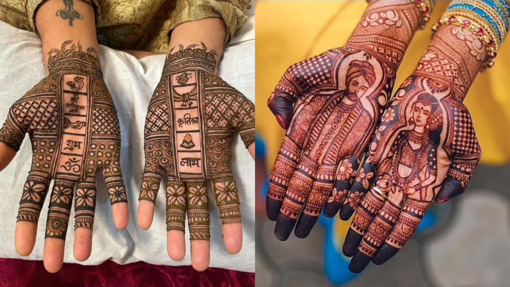 - Couple Mehndi: दूल्हा-दुल्हन दोनों के हाथों में मिलते-जुलते या एक-दूसरे के नाम वाले डिज़ाइन।
