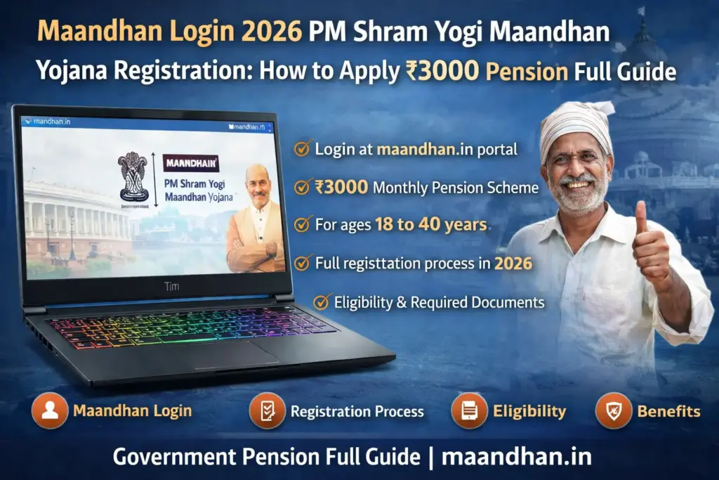 PM Shram Yogi Maandhan Yojana 2026 में असंगठित श्रमिकों को 60 वर्ष के बाद ₹3000 मासिक पेंशन मिलती है। 18 से 40 वर्ष के लोग इस योजना में आवेदन कर सकते हैं और सरकार भी समान योगदान देती है। यहां जानें maandhan login प्रक्रिया, रजिस्ट्रेशन, पात्रता, लाभ और जरूरी दस्तावेजों की पूरी जानकारी। 2026 में इस सरकारी पेंशन योजना का फायदा कैसे उठाएं, पूरी गाइड पढ़ें।