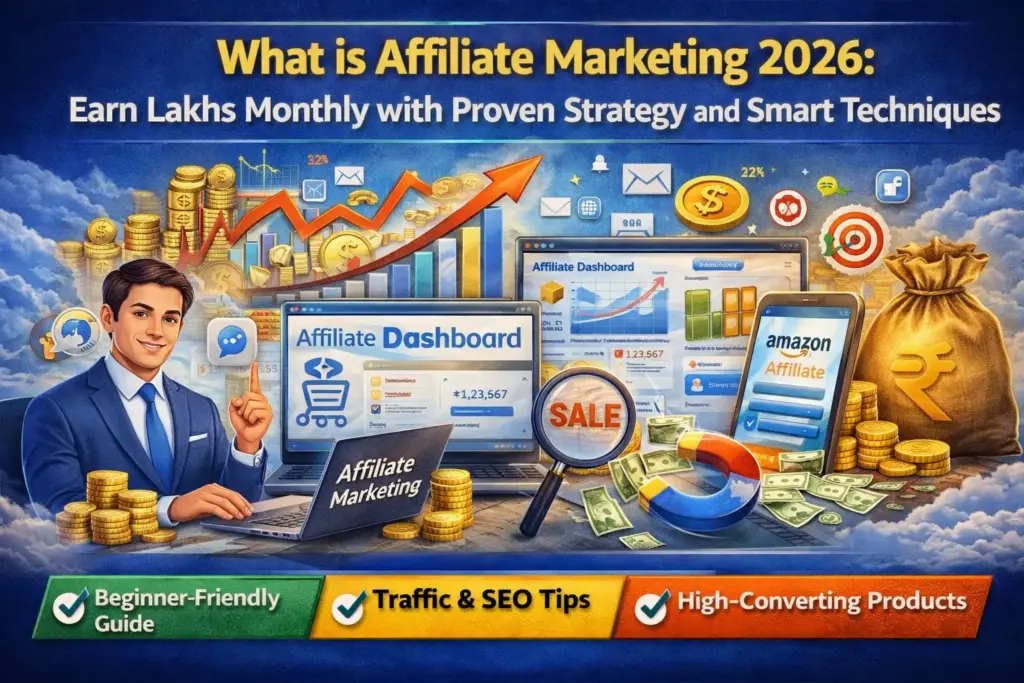 Affiliate Marketing 2026 में ऑनलाइन पैसे कमाने का सबसे आसान और powerful तरीका है। इस guide में जानें कैसे आप zero से शुरुआत करके हर महीने लाखों रुपये कमा सकते हैं। इसमें step-by-step strategy, best platforms, SEO tips और high converting products की जानकारी दी गई है। अगर आप बिना investment के passive income बनाना चाहते हैं, तो affiliate marketing आपके लिए best option है। आज ही शुरू करें और अपनी earning बढ़ाएं।